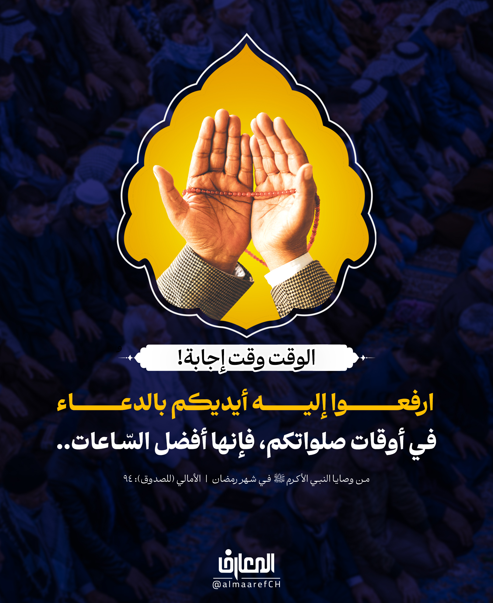 ارفعوا إليه أیدیکم بالدُعاء في أوقات صلواتکم، فإنَها أفضلُ السّاعات..